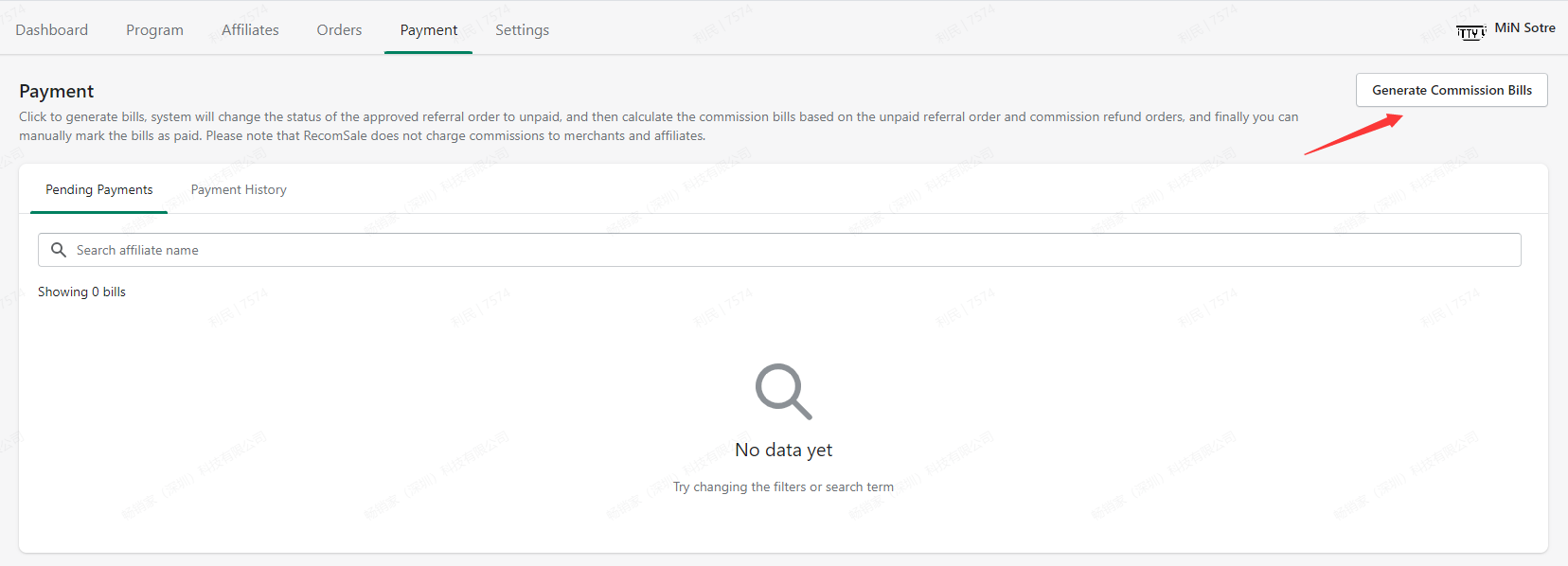 In the "Payments" menu, merchants can click "Generate Commission Bills" and the system will change the status of approved affiliate orders to Unpaid. After the status of the affiliate order is changed to Unpaid, if you think the affiliate order does not meet the requirements, you can invalidate it, and the commission amount will also be invalid, and the bill will not include this part of the commission.