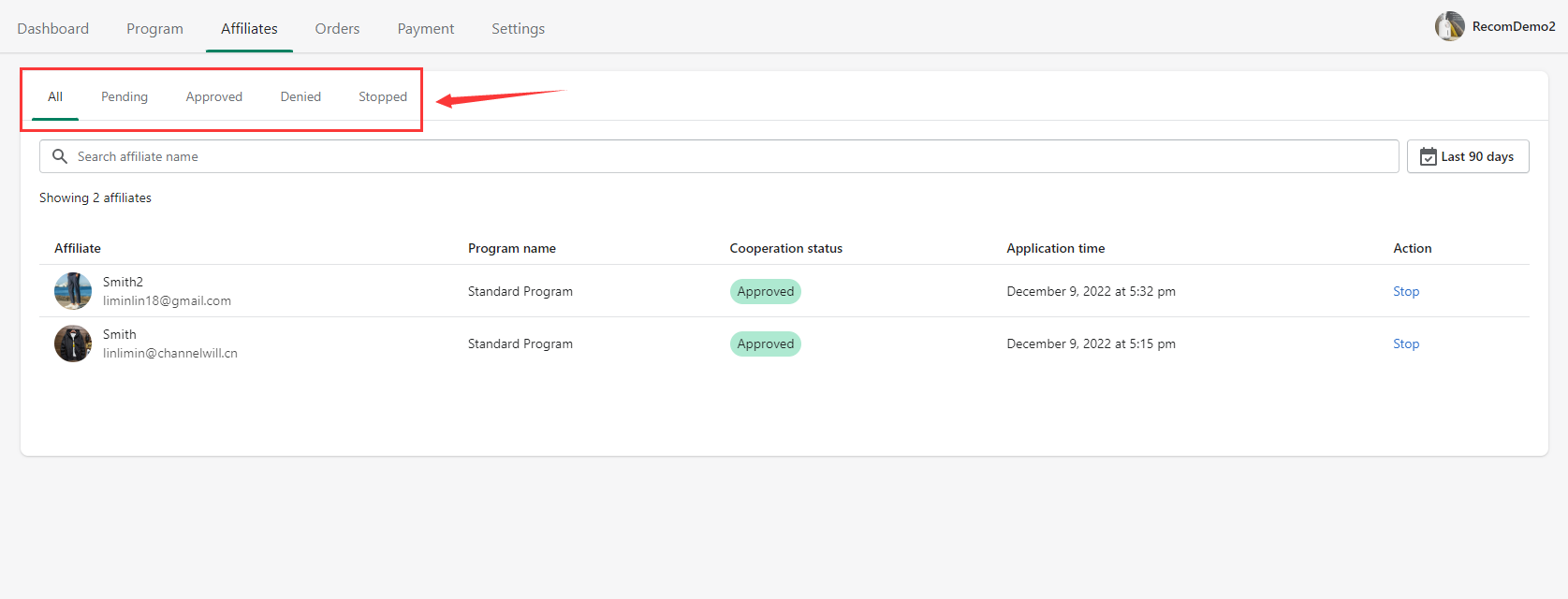 Affiliates cooperation status with the program includes Pending, Approved, Denied, and Stopped.&#x20;