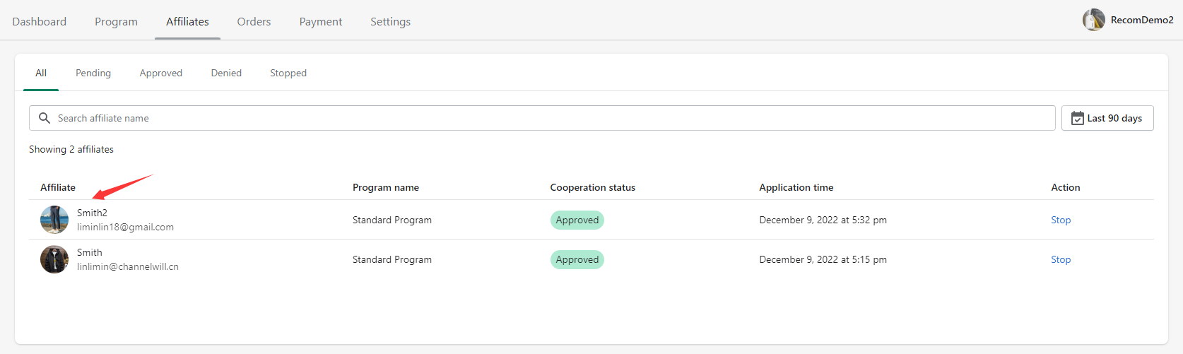 Click on the affiliate avatar in the list to view the affiliate information.