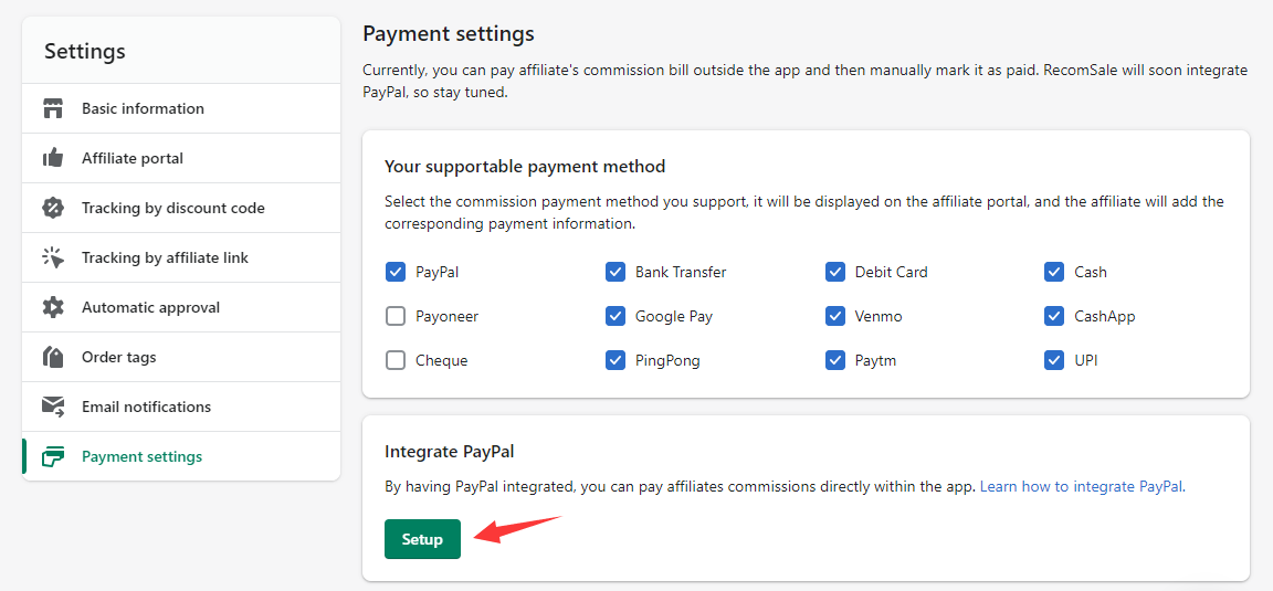 Go back to RecomSale App > Settings > Payment settings and click Set up